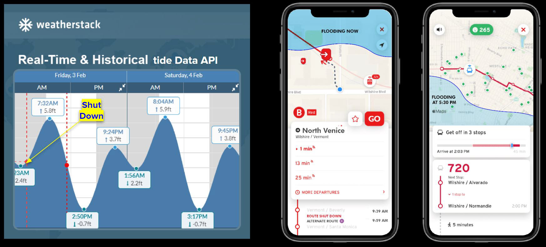 2. Real-time Computing: Utilized data science to provide timely updates on available bus stops and maps that reflected the sea level rise. The transit application showed changing routes and available stops in real-time while taking into account weather data inputs such as flooding, severe weather, or traffic jams.