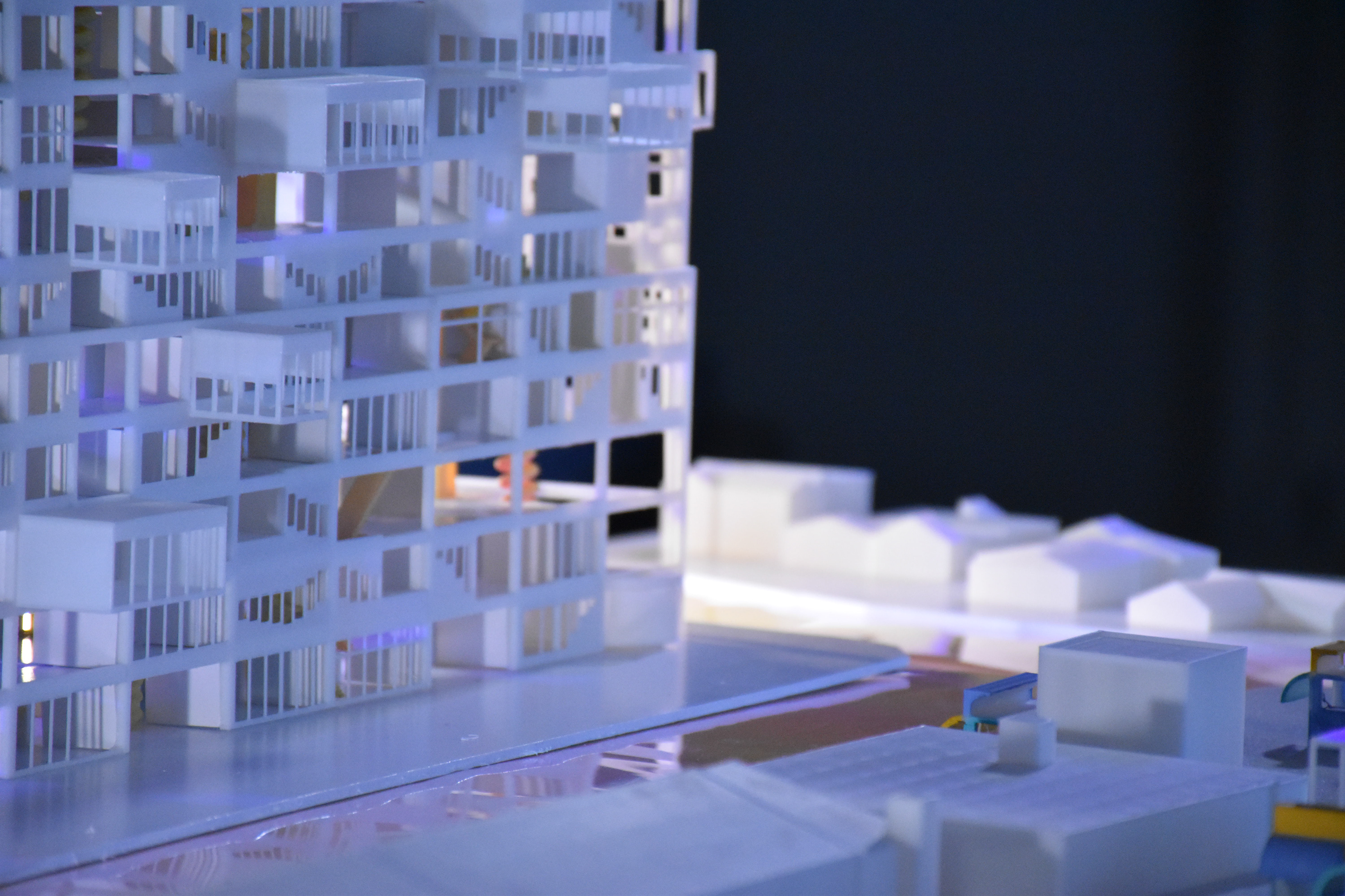 By establishing standards and ensuring uniformity in housing, with a width of 12 meters, it allows for the adoption of a 12 by 12 meters square for easier replication and contrasts with the conventional rectangle. This module is repeated for at least eight floors to accommodate residents moving from the flooding district, including additional non-residential programs. The elevation is white to reflect sunlight in different seasons and weather conditions. The number of units corresponds to the size of the site, with the street, neighborhood, or entrance reflecting the site's contours. The irregular spaces assume the role of main lobbies or management offices. The second aspect revolves around the system of industrial housing. Individuals can choose from various customizable architectural elements, such as circulation, including stairs, slopes, slides, and windows. Units can select their elements based on spatial privacy needs, changing inhabitants, and circulation patterns. Lastly, commercial programs, such as marketplaces, goods customization studios, and trading spaces, provide alternative outposts to historic retail commercial programs that solely focus on buying and selling behaviors. These new spaces support product delivery, fixing, customizing, and reselling, bridging different programs.