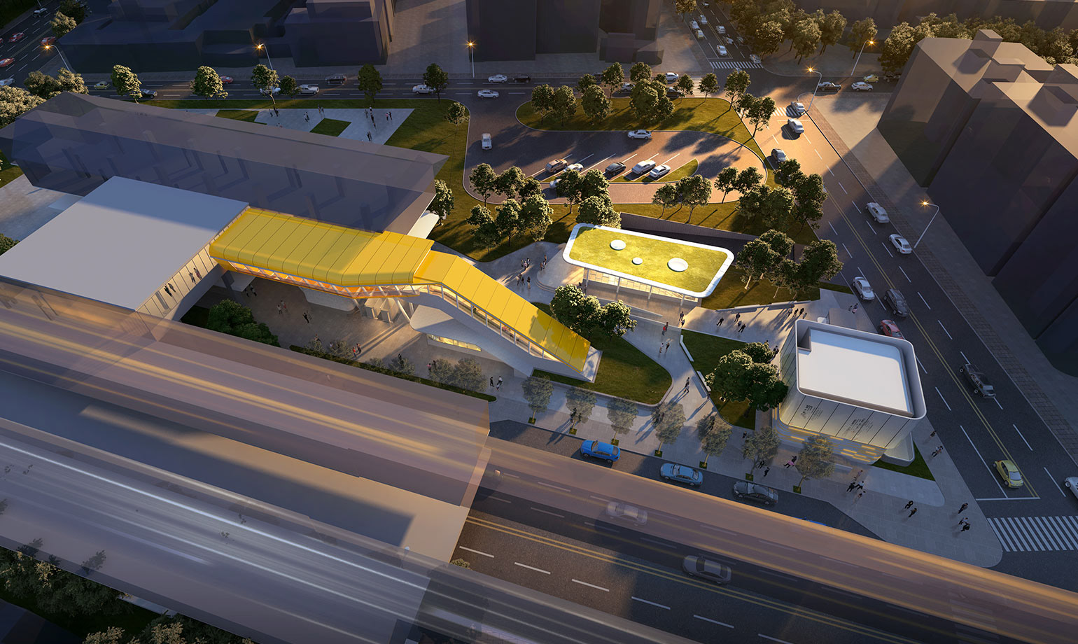 The station design concept incorporates the idea of "rippling" arcs, with each station serving as the core of the city center. The expanding water ripples extend activities, allowing nature to rise from the station's body while simultaneously connecting cultures between stations. The design strategy employs flowing arcs to differentiate the station roof from the geometric forms found in the city, creating station identification. The use of reflective materials on the folded ceiling design allows natural light to enter the interior, connecting the inside space with nature. The transparent material and lighting elements soften the rigid mass elements, becoming the focal point of urban gathering. The extended platform space can accommodate the activities of the surrounding environment.