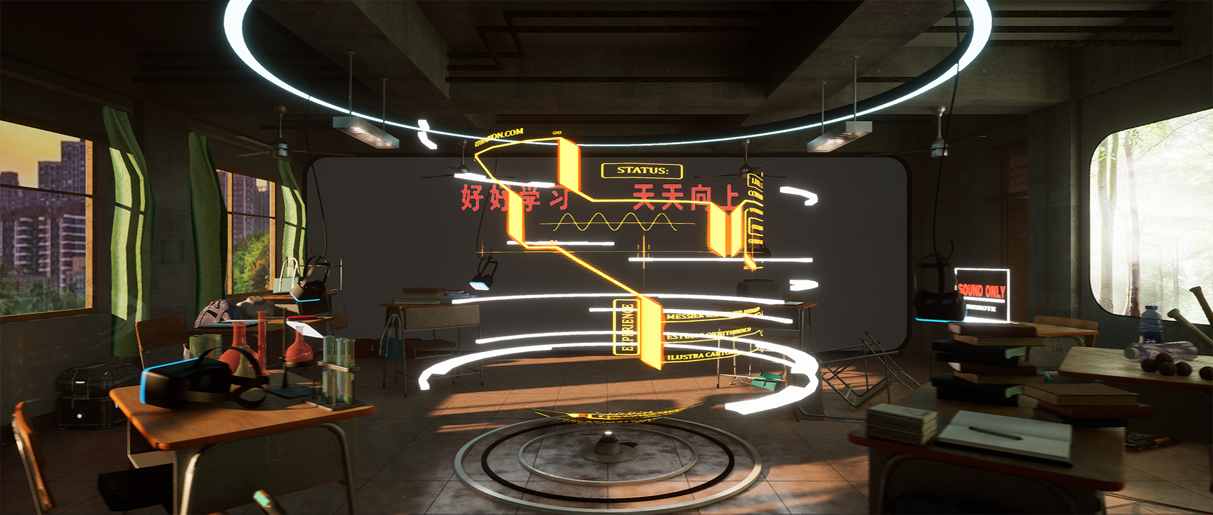 However, this classroom is filled with high-tech equipment. In the center, there is a hologram, and VR classes are suspended in the air. A shelf of supplies is hidden behind the main screen. Above the board, the classic slogan "Study hard and make progress every day" is written. The student's desks are arranged in unique ways, reflecting their personalities. The chemistry nerd has all of their equipment laid out, the reader has piles of books stacked up, and the sports enthusiast has left behind their water bottle and baseball set. The musician has placed their guitar and keyboard on the desk, and a "SOUND ONLY" screen belongs to a student who never appears in person. Someone has knocked down a desk set and rushed out too fast. In the background, the students' laughter can be heard from the sports yard while someone runs across the corridor. As the bell rings, it serves as a reminder that the school day has come to a close.
